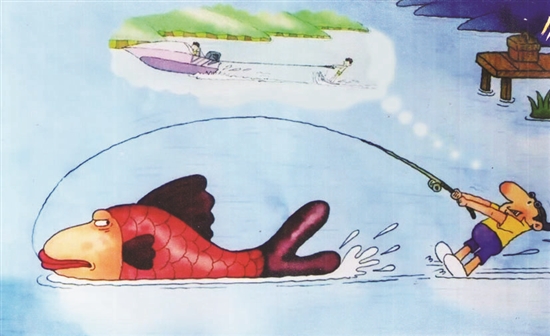 丰富多彩的水上运动,变化多端。恰巧垂钓者钓住大鱼,由于无法收杆竟因势利导,将“静态”养生变成动态冲浪。