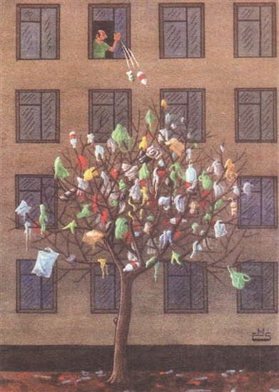 生活中,楼上抛物是人们嗤之以鼻的恶行。这里的居民从窗户丢弃的塑料和纸质口袋,制造了奇特的“树”,真令人讨嫌!