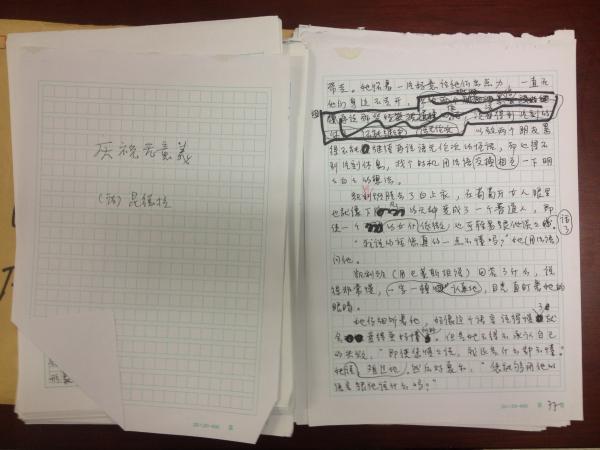 马振骋翻译《蒙田随笔全集》全凭手写,因为他不会使用电脑打字。近2000页的作文稿纸上,满眼是不断修改后留下的痕迹。马振骋说,“我对自己的译文还是满意的,我想这样一部书,在今后五年、十年也不会再有人去重译了,毕竟这是件吃力不讨好的事情,我是真的喜欢蒙田。”