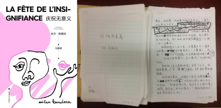 米兰·昆德拉作品《庆祝无意义》中文版书封和马振骋的翻译手稿
